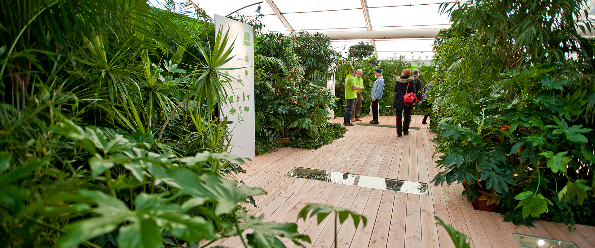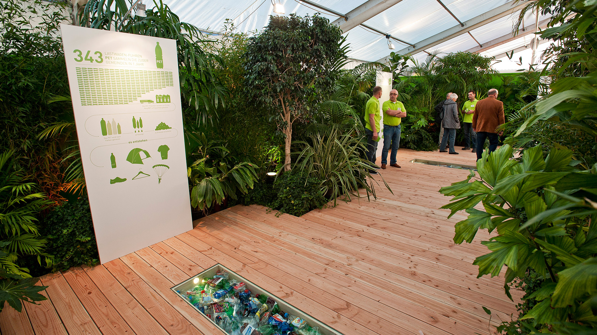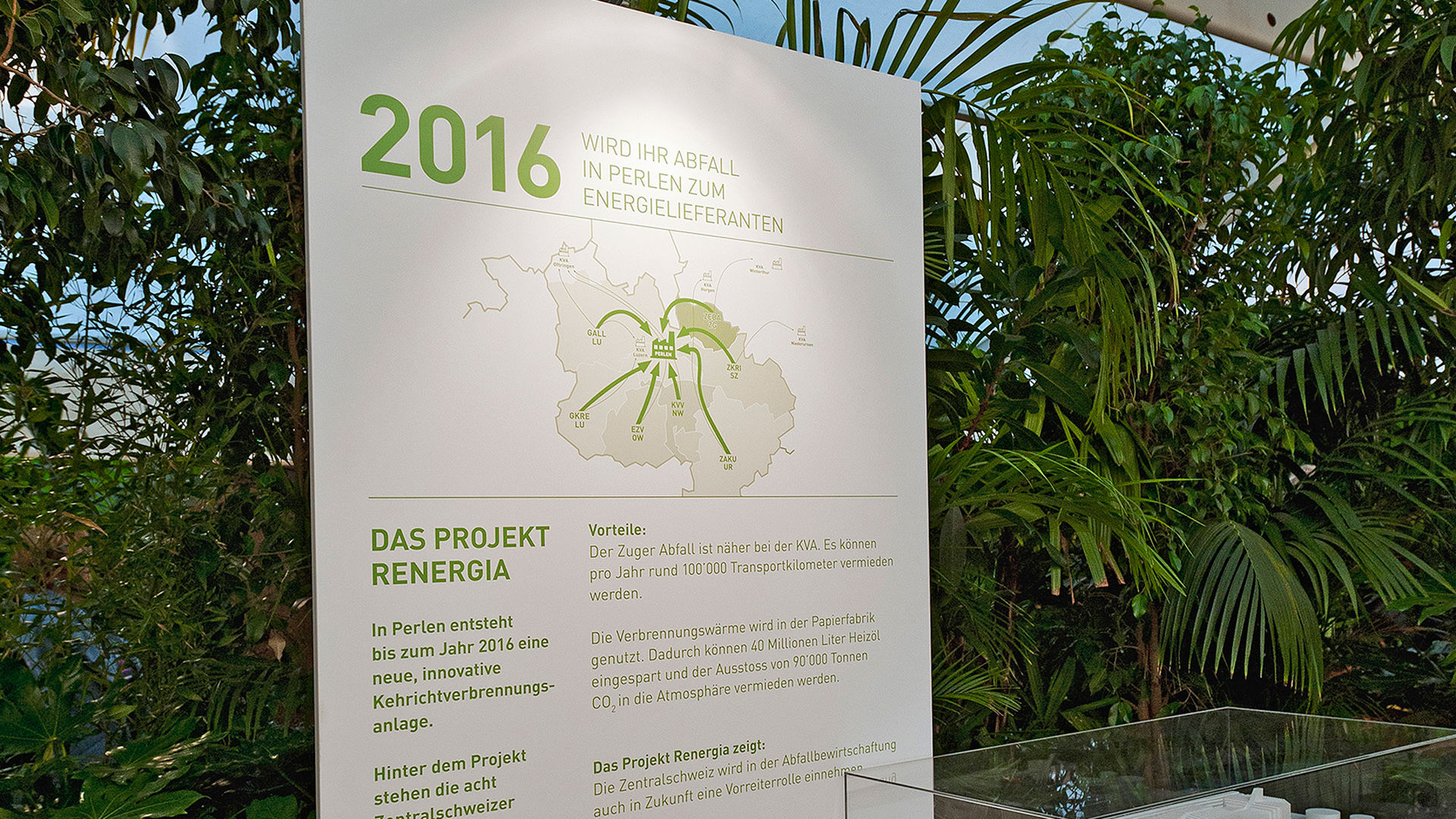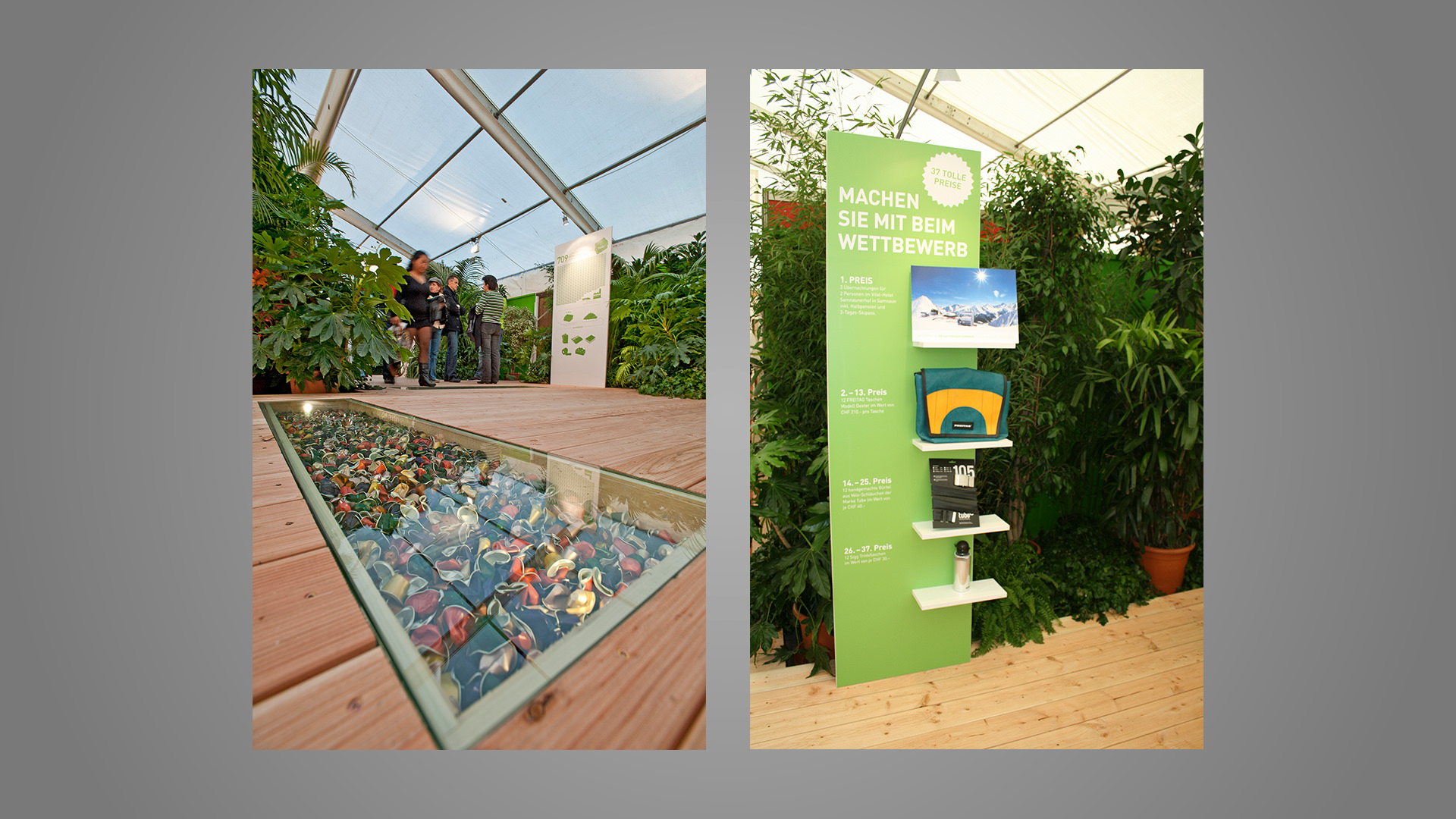 Die Besucher wurden mitten in der Messe ins Paradies einführt. Anstelle der üblichen Messewände wurden Bäume und Sträucher gesetzt, zudem sorgte Vogelgezwitscher und Urwaldgeräusche für die akustische Atmosphäre. Infotafeln orientierten, welche Produkte aus den jeweiligen Fraktionen neu entstehen. In den Durchgangsbereichen der Messe wurden zusätzlich F12 Plakate aufgehängt, auf denen die Buchstaben des Wortes ZEBA aus Recyclingmaterial geklebt, auf die Sonderschau aufmerksam machten. Bereits im Vorfeld der Messe wurden an den Entsorgungsstellen Dankeschön-Karten mit aufgeklebtem Schoko-Herz an die Zuger Bevölkerung verteilt.